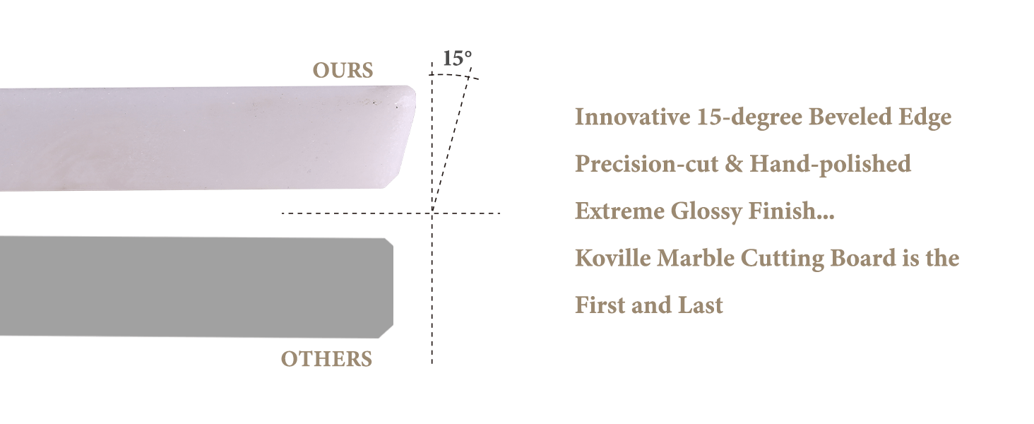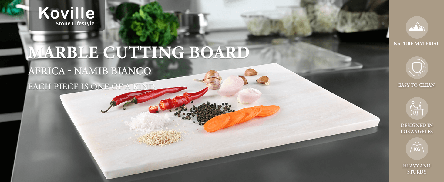 CRAFTED 15°BEVELED-EDGE: Koville marble cutting board for kitchen is crafted with innovative polished beveled edge, not only enhances the aesthetics of the board but also serves a functional purpose. The beveled edges provide a comfortable grip and make lifting and moving the board a breeze.