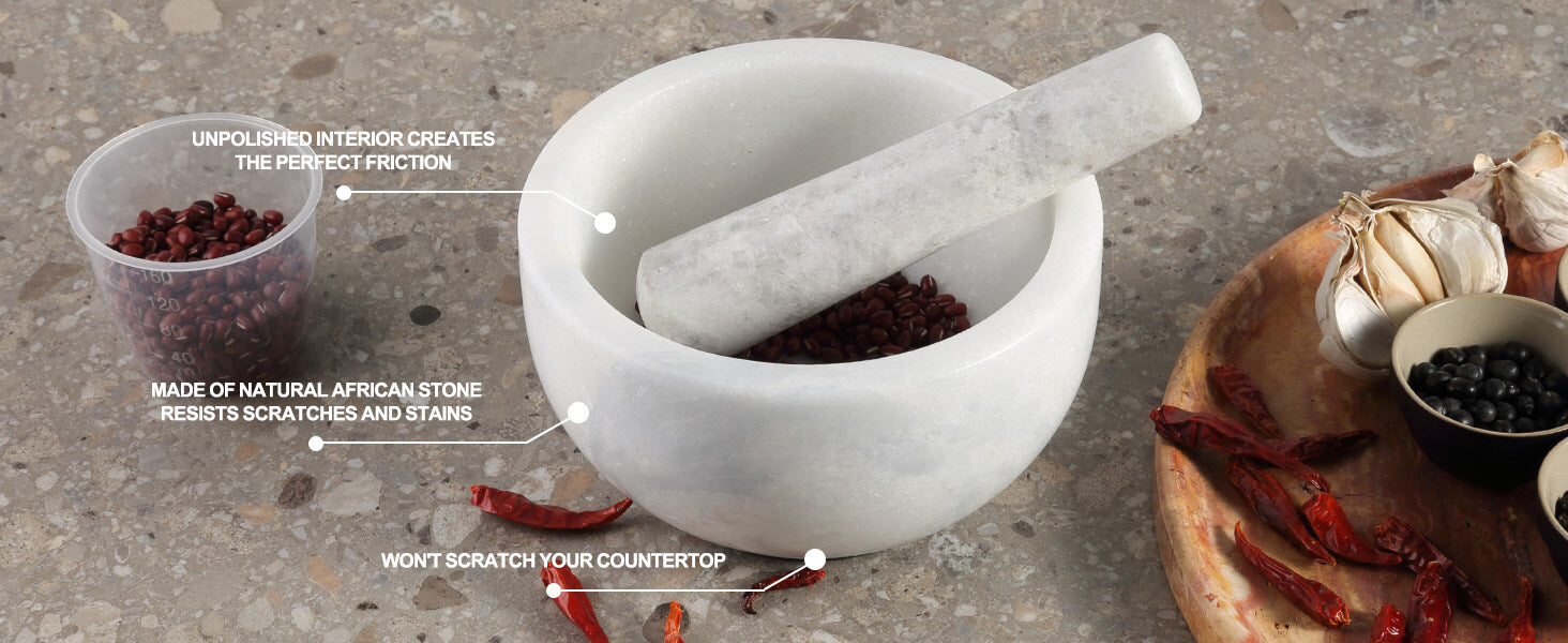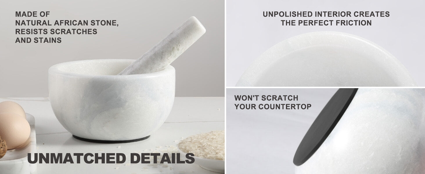 Each Piece is one of a kind: The Mortar and Pestle is made of actual marble with rich white crystals, like glazed white jade. Because the different distribution of natural stone crystals, each piece is one of a kind. It is heavy-duty and durable, both gorgeous and functional.