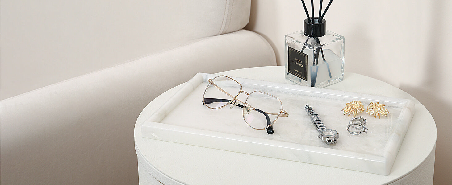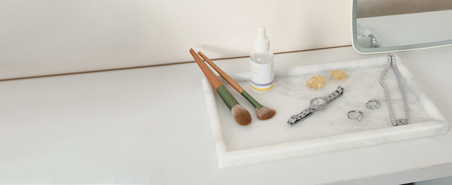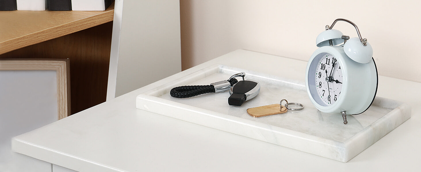 PRACTICALITY & PRETTY: Koville high-end natural marble Bathroom Countertop Tray is durable. It is not only the best match for practical storage, but also a beautiful decoration for modern homes. Because the different distribution of natural stone crystals, each piece is one of a kind.