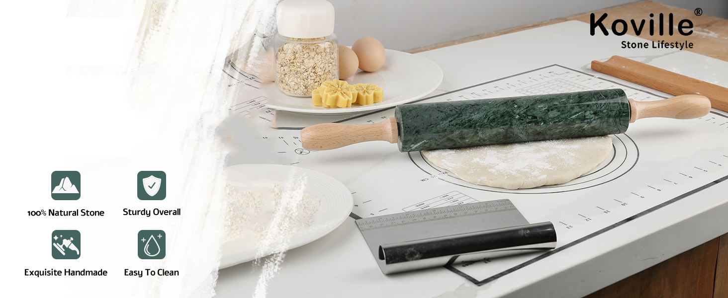 Exquisite Indian Green Marble: Made of premium Indian Green Marble, the Koville natural marble rolling pin is both beautiful and functional. Each rolling pin is truly unique, with its refreshing green tone and one-of-a-kind veining. The polished marble surface ensures longevity, resisting cracks and warping. The natural coolness of the stone keeps the dough from sticking, making your baking process smoother and more enjoyable.
